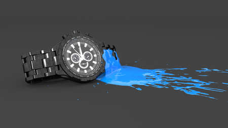 wrist watch covered with blue paint in the form of a blot, 3d illustration