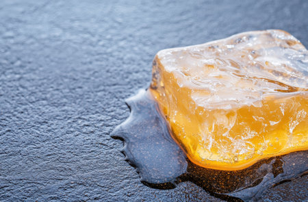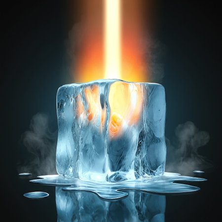 A glowing ice fragment dissolves on a shiny surface, casting a golden hue as gentle steam ascends in a softly lit, serene atmosphere.
