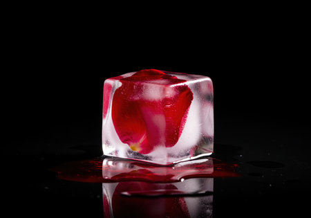 Ice cube on black mirror surface. Space for text