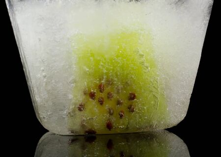 Slice of kiwi fruit frozen in ice on a black background
