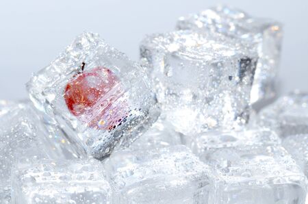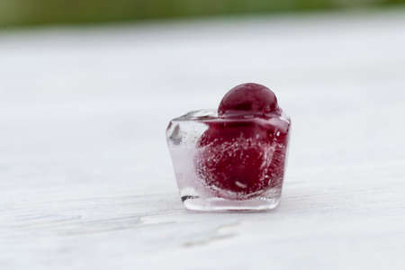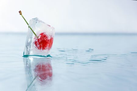 Cherry berry frozen in ice cube. Berry iceberg. Romance decoration, refreshment icy berry.