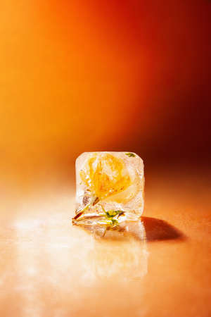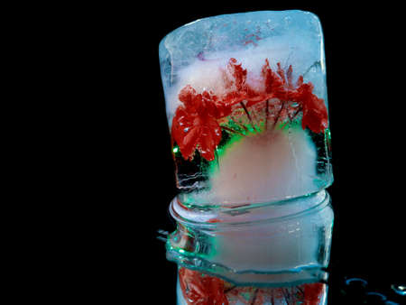 Flower frozen in ice cube. Flower iceberg. Romance decoration, refreshment icy flowers.