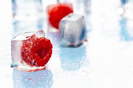 Fresh raspberry frozen in the ice cube