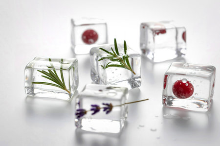 Transparent ice cubes containing fresh rosemary sprigs and red berries, arranged artfully on a white surface, suggesting a sophisticated beverage.