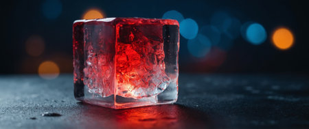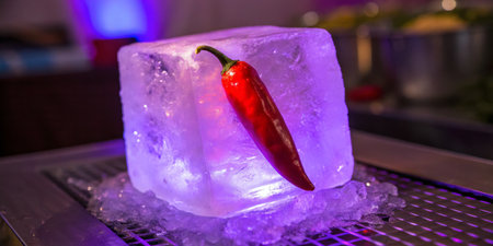 A striking red chili pepper sits atop a shimmering ice block, glowing under colorful lights.