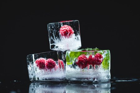 Raspberry frozen in the ice cube. Black background.