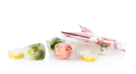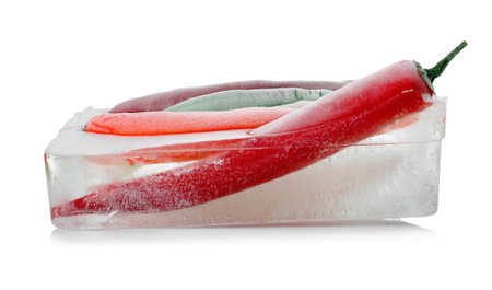 Chili peppers in ice cube on white background. frozen vegetables