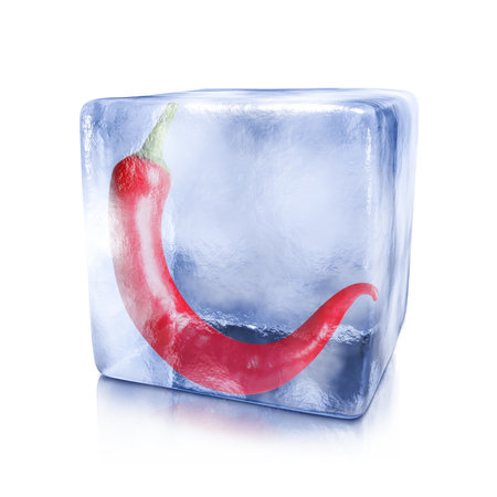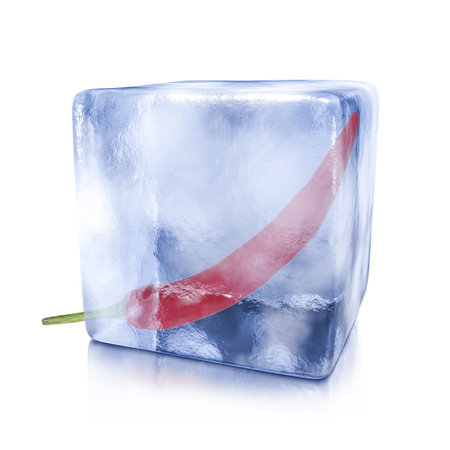 Red chili pepper in ice cube isolated on white