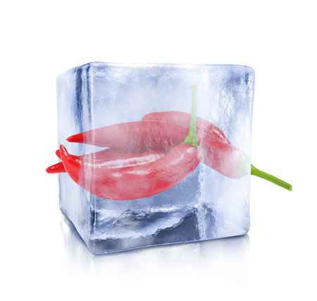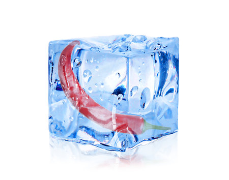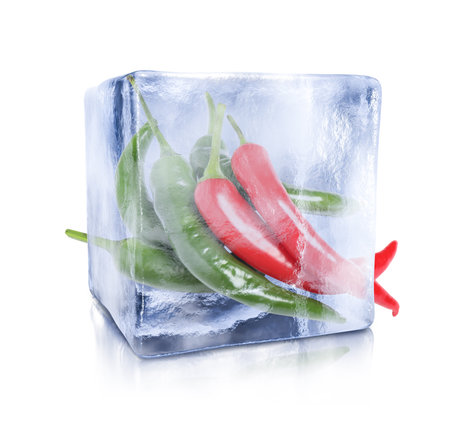 Hot chili peppers in ice cube isolated on white
