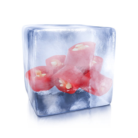 Sliced red chili pepper in ice cube isolated on white