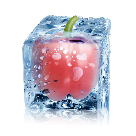 Fresh red bell pepper frozen in ice cube on white background