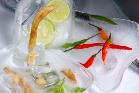Thai vegetable garden, chilli, lime, galangal, basil leaves frozen in large ice cubes Prepare a delicious dinner
