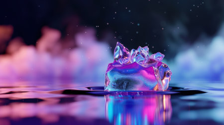 A stunning image of a glowing ice block on a serene water surface, surrounded by mountains during sunset, showcasing the contrast between warmth and cold.