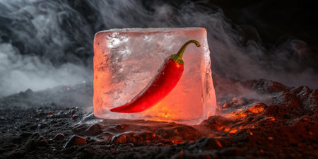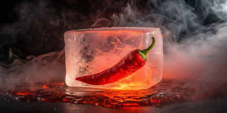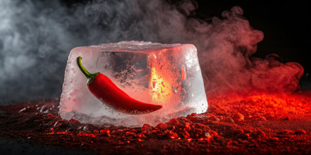 A vibrant red chili pepper is encased in sparkling ice, set against a dramatic smoky background.