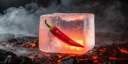 A vibrant red chili pepper rests inside a clear ice block on smoldering volcanic stones.