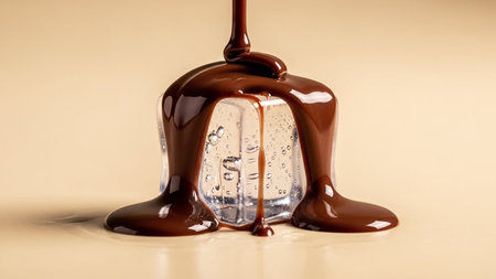 Dfgdguh showing chocolate syrup pouring over ice cube melting on beige surface. High resolution image...