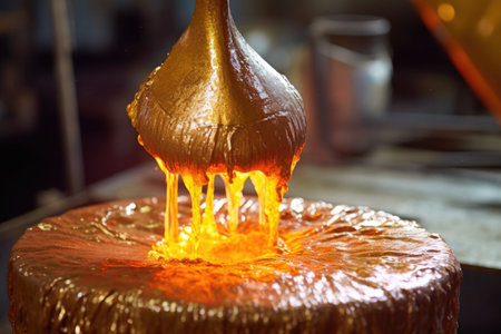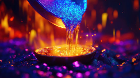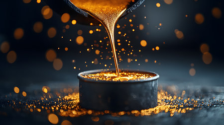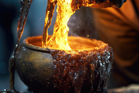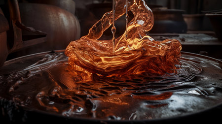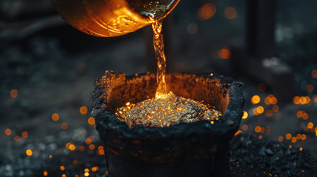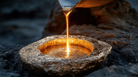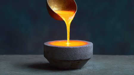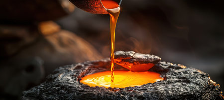 A captivating scene of molten amber liquid pouring from a metal ladle into a textured stone bowl, showcasing warmth and artistry against a dark background, evoking creativity and craftsmanship.