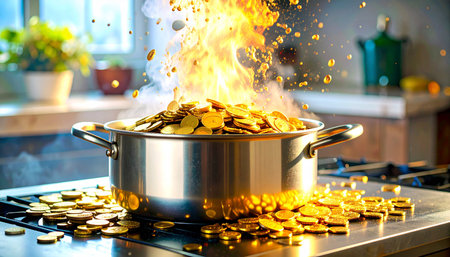 Metal cooking pot filled with gold coins bubbling and overflowing on a stovetop, symbolizing overheated markets or inflation, dramatic steam and lighting
