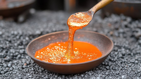 A vibrant orange liquid substance flows from a wooden spoon into a metal container, capturing details of texture and color, perfect for craftsmanship themes.