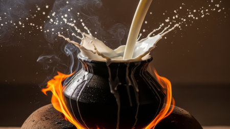 A metal container holds bubbling liquid, with flames rising from the surface for a dramatic effect.