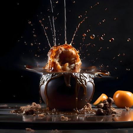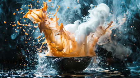 A dramatic capture of milk and coffee splashing in a dark setting, creating an artistic and dynamic visual effect.