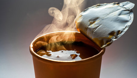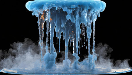 A dramatic close-up of water splashing into a metallic bowl, with steam rising around, creating a dynamic and captivating visual effect.