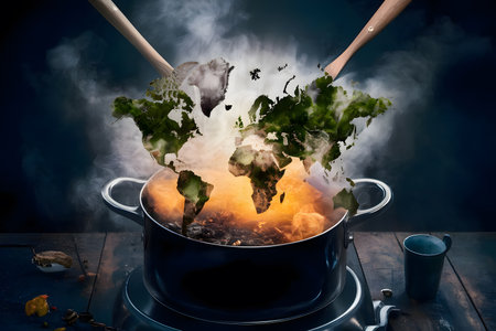 Craft a thought-provoking image portraying humanity's collective struggle against climate change, using the metaphor of the world being cooked in a pot to convey the urgency of action needed to prevent environmental catastrophe, Generative Ai