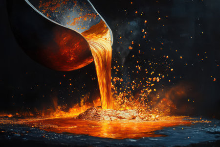 Molten Metal Pouring into Mold with Glowing Orange Hues and Dramatic Lighting