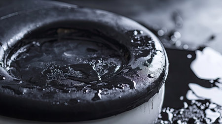 Globs of a dense black substance drip from a rough gray surface against a contrasting background showcasing fluid dynamics and texture.