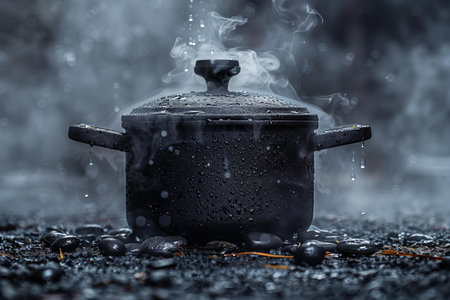 Bubbling cauldron of colorful magic potion with mystical steam and alchemical essence