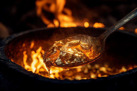A spoon lifts shimmering molten gold from a darkened pot, surrounded by dancing flames. The vibrant glow illuminates the richness of gold in the midst of a passionate creation process.