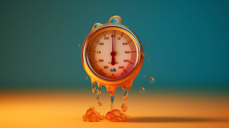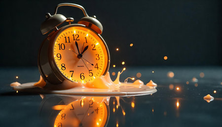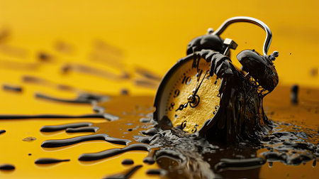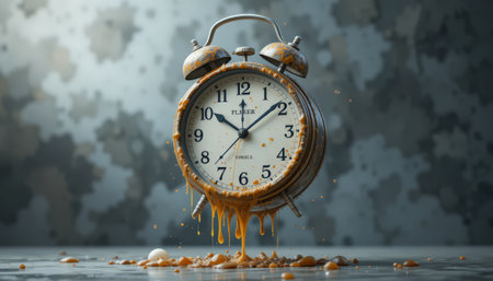 This striking image features a melting alarm clock, oozing vibrant orange liquid on a gray surface, embodying concepts of time distortion and artistic expression.