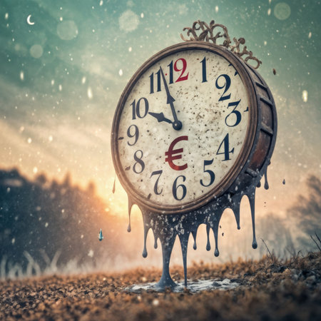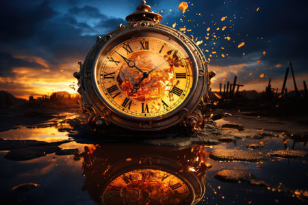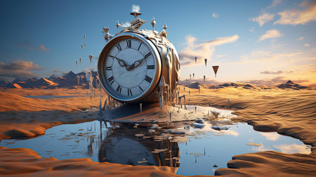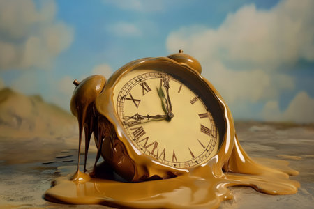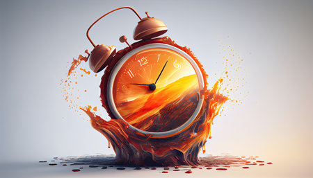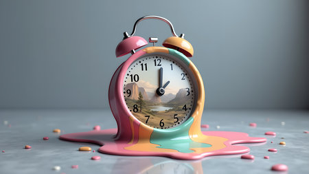 Surreal image of a melting alarm clock with a landscape inside, symbolizing the abstract concept of time passing. It evokes a sense of urgency with a touch of whimsical nostalgia.