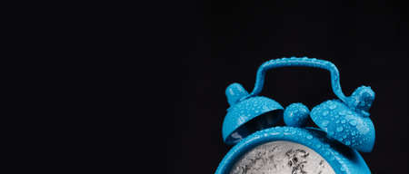 alarm clock on a balck background, water drop. Alarm clock on black background. Business concept and time management idea