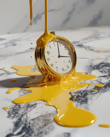 Melting clock drips vibrant yellow paint on elegant marble surface creating an artistic display of time and color