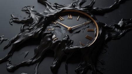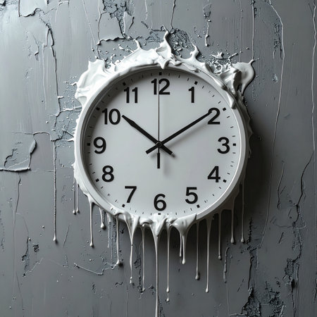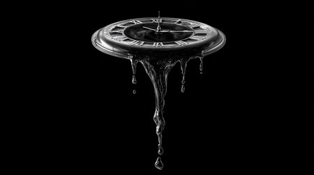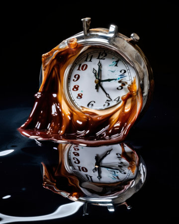 The clock features melting hands and splashes, illustrating the fluid nature of time as it drips and bends in a captivating design.