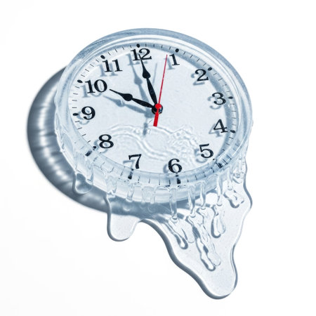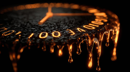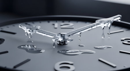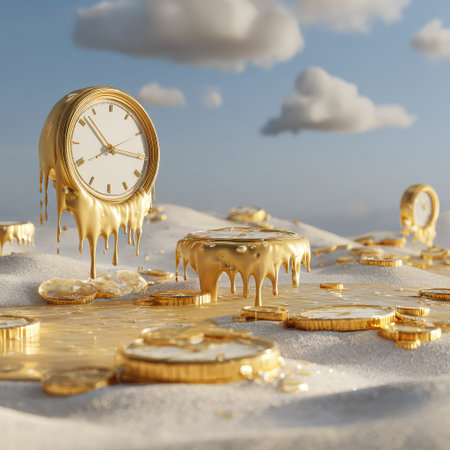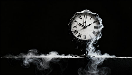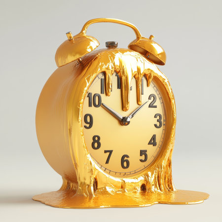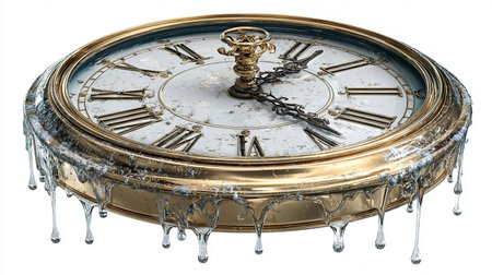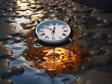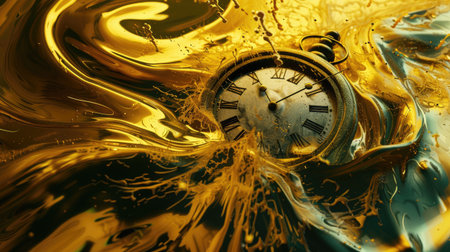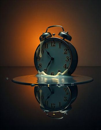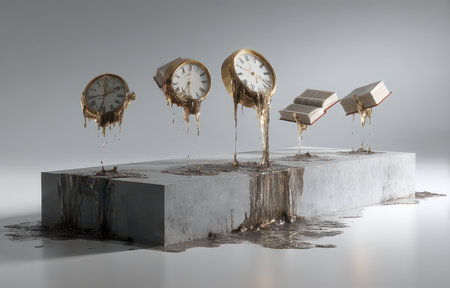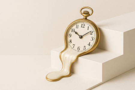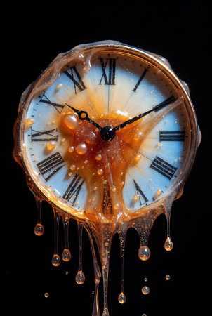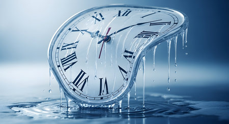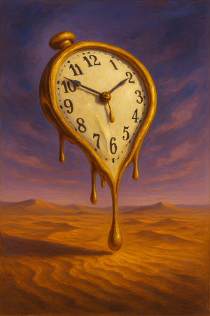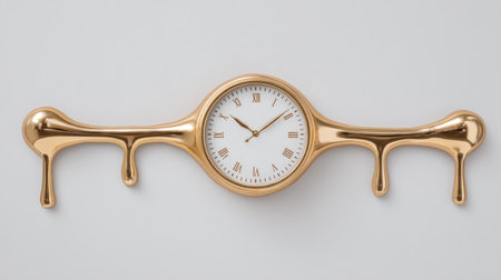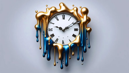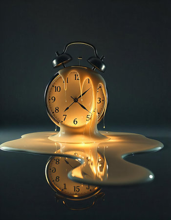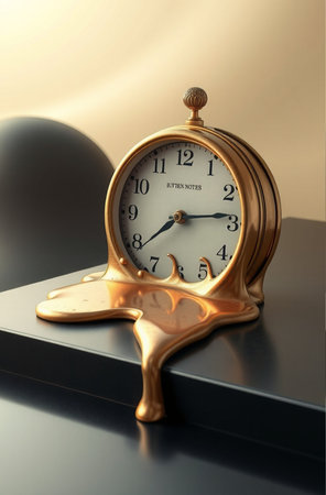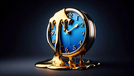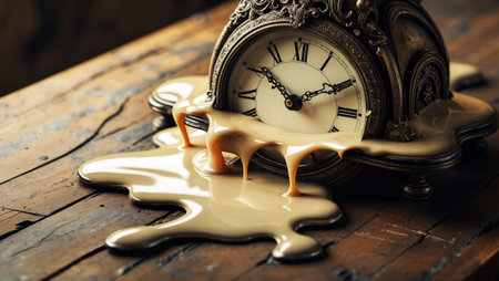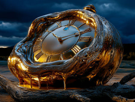 Surreal illustration of a golden and mercury clock melting in a distorted, fluid manner, representing the illusion of time