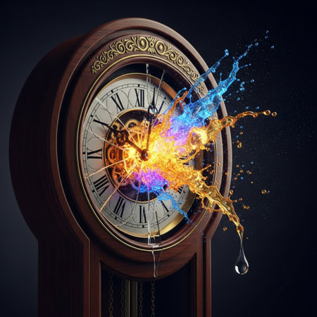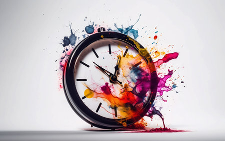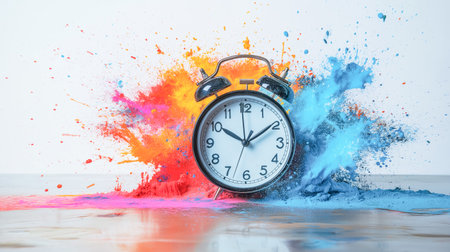 Vintage clock with colorful splashes. Time concept. 3D Rendering