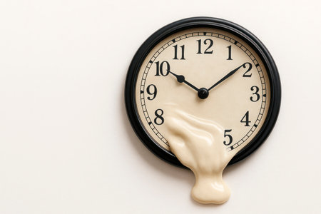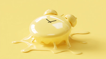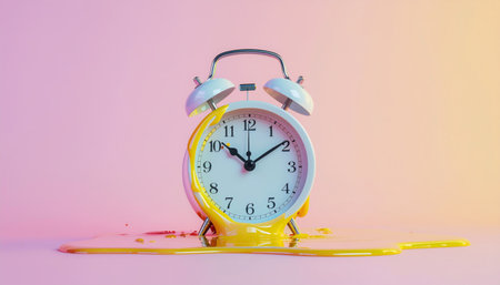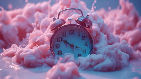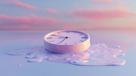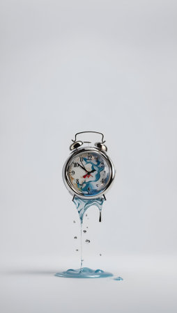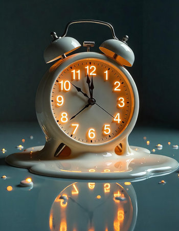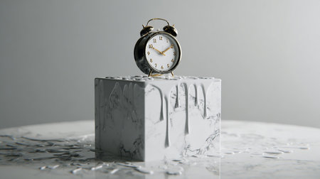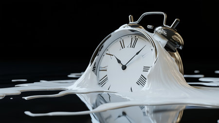 A surreal alarm clock melting into a glossy white surface, capturing the essence of fluidity and time