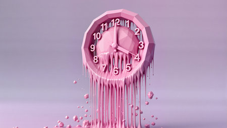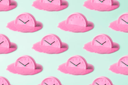 A surreal melting alarm clock forms a bright yellow puddle on a vivid pink and orange gradient background, illustrating the concept of time slipping away