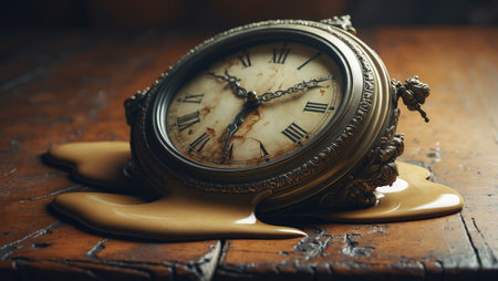 Melting clock rests on a wooden surface, symbolizing the passage of time in a surreal manner
