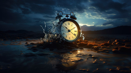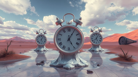 A surreal image featuring melting clocks floating in water, reflecting the distortion and fluidity of time. This evocative scene captures the ephemeral nature of existence.