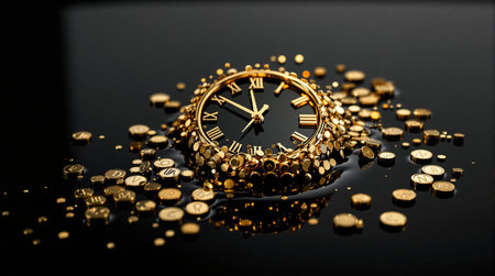 Elegant golden luxury watch surrounded by shimmering coin pieces on black background.