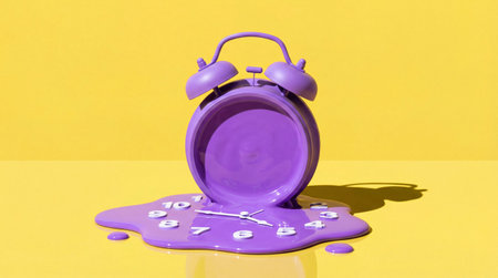 Purple Alarm Clock Melting Slowly on a Bright Yellow Surface, Symbolizing the Passage of Time and Its Effects