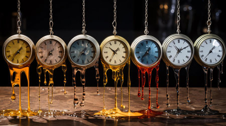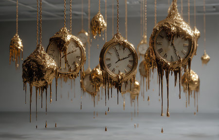 Artistic installation featuring clocks dripping with gold, representing the fluidity of time and beauty. Ideal for modern art and decor themes.