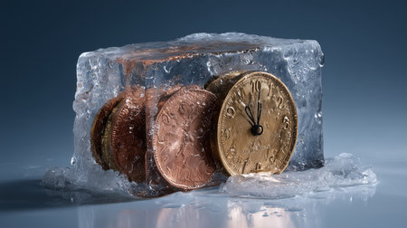 Time Is Money Concept with Vintage Clock and Currency Locked in Ice Block