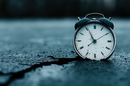 An old alarm clock rests on cracked ground during twilight, symbolizing the passage of time.