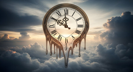 The artwork showcases a clock with elongated, melting hands, creatively representing the fluidity and passage of time in an ethereal environment.