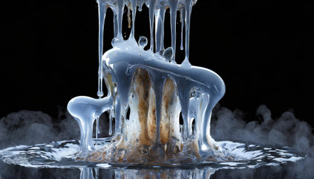 This visually captivating digital artwork showcases a frozen, abstract D texture of liquid smoke dripping gracefully, suspended in mid-air with an ethereal, futuristic vibe. Isolated on a