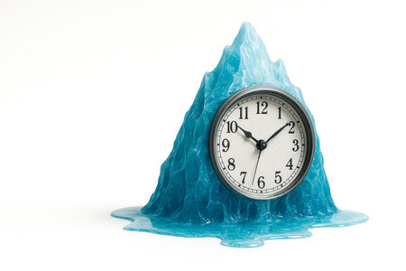 A clock covered in ice on a clean background. Space for text